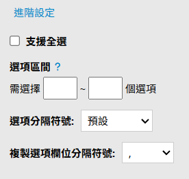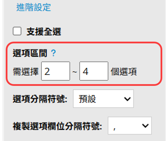 2. 选项区间:可设置最少选项数与最多选项数。两者可个别或同时设置,未设置的字段留白即可。